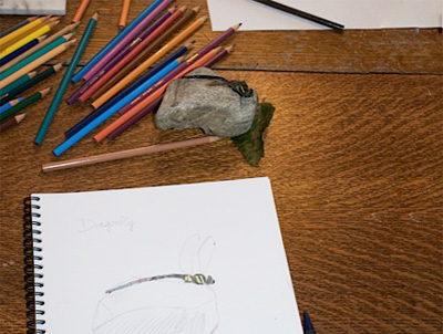 On a piece of paper, mark an X in the center. Write a symbol describing the sound of a bird or the wind, in the direction you hear it. I’ve led this activity for both children and adults, and we are always amazed at what we hear when we truly listen. I like to use a 5x7 index card or a small clipboard with paper. Colored pencils or crayons can be used to draw a symbol or write words describing the sounds around us.